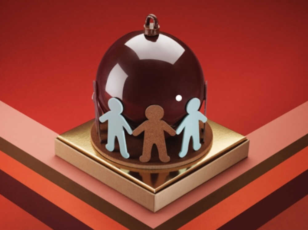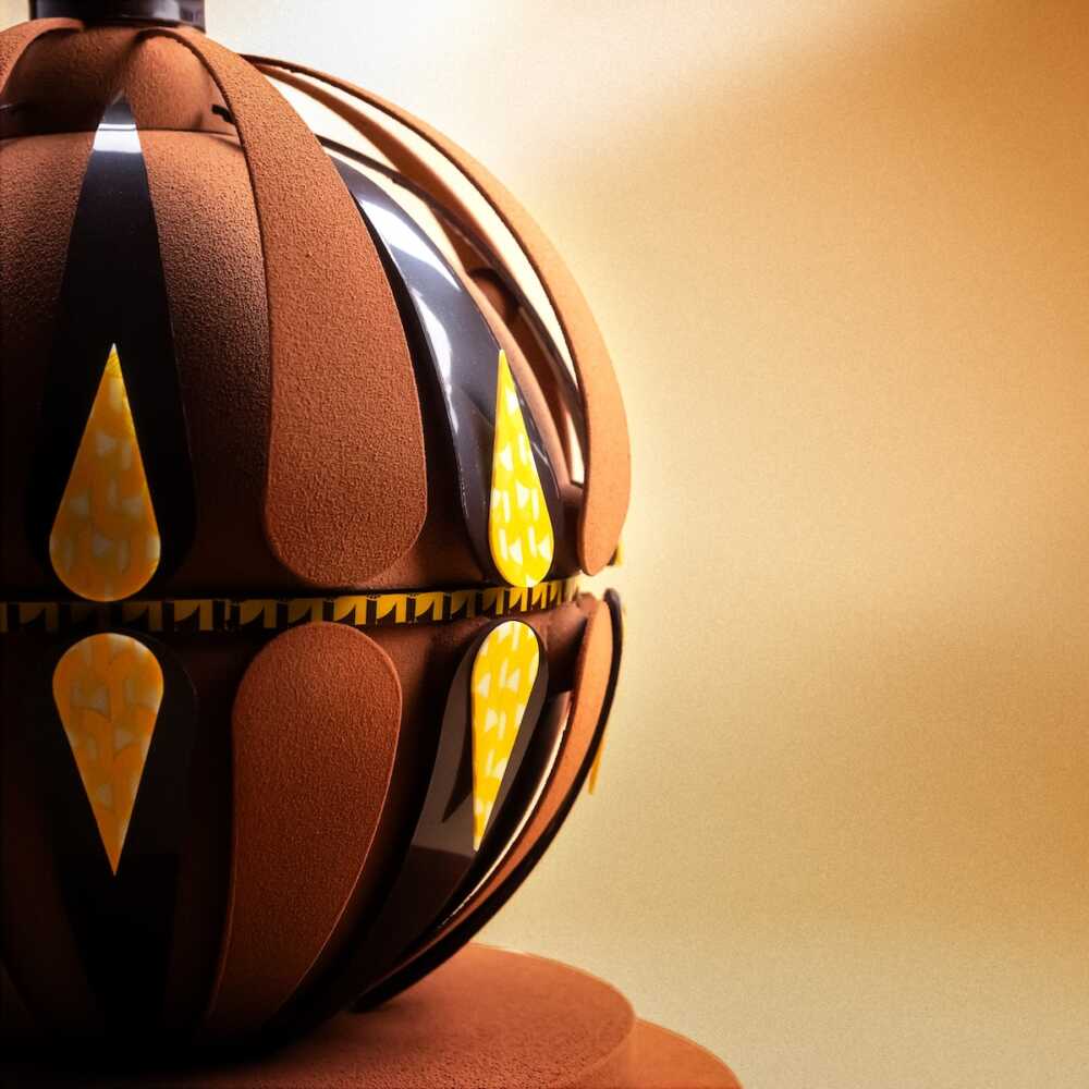 La meilleure pâtissière du monde prend cet hiver la direction de l’Alsace, avec sa fabuleuse Boule de Noël. Abritant 20 fritures et mendiants cachés sous sa coque, la sphère en chocolat au lait est peinte à la main. Elle s’inspire de la féerie de ses marchés de Noël et de l’odeur de sapin pour conjuguer subtilement entremets aux saveurs d’agrumes, pain d’épices, miel, fruit de la passion et clous de cannelier. Une belle poésie gourmande ! 10 parts : 150€. delicatisserie.com