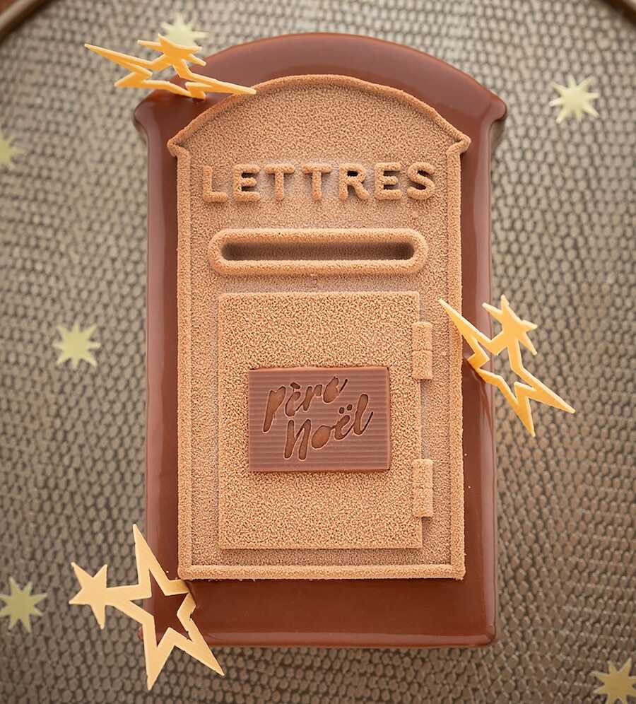 Après son premier coffee shop au Printemps Haussmann, Christophe Michalak fait un clin d’œil à ceux qui écrivent au Père Noël en postant leur missive dans une boîte aux lettres d’antan. Cette année, il leur livrera une pâtisserie pleine de poésie. Elle est faite de dacquoise pistache, croustillant praliné pistache façon Dubaï, crémeux pistache, praliné pistache, mousse au chocolat au lait et crémeux au chocolat noir. 8 parts : 95€. christophemichalak.com