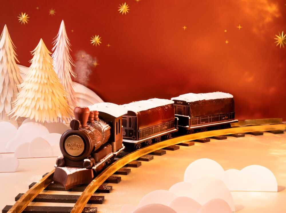 Création du champion du monde de pâtisserie, Étienne Leroy, ce train qui serpente entre les sapins passera la nuit de Noël. Sa locomotive est en chocolat et ses 2 wagons bûches aux toits sont poudrés de guimauve. Sa composition mêle grué de cacao, praliné noisette, biscuit mœlleux au cacao, crémeux au chocolat noir et lait, mousse onctueuse au chocolat noir, ainsi qu’un onctueux glaçage au cacao. 8-10 parts : 190€. lenôtre.com
