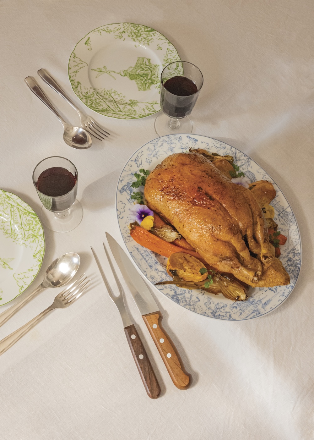 Pour une table chaleureuse, le boucher des stars propose une cuisson en douceur. La volaille repose dans un plat, avec huile d’olive, sel et légumes. Le four chauffe à 130°C pour une cuisson lente et fondante. On l’arrose toutes les 20 minutes, dès la première heure. Les châtaignes et les citrons confits rejoignent le mélange en fin de cuisson. Les airelles se déposent au service, pour une touche vive et colorée. Le dressage joue alors les contrastes entre tons dorés, rouges et orangés.