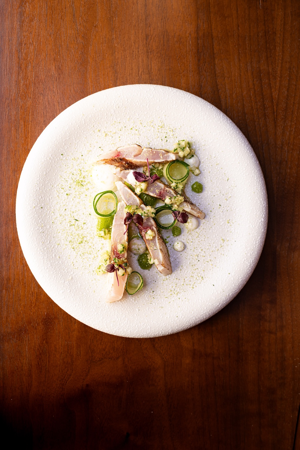 On se rassure, en retrouvant le bar, cette fois enveloppé de racines lumineuses et drapé d’argile. Plus classe, plus cossus, plus sophistiqués, les volumes du lieu semblent le faire monter en gamme. La cuisine a aussi pris du galon. La preuve dans les assiettes ciselées qui dévoilent une maturité jamais encore égalée par Denny Imbroisi. On sent le chef libéré, puisant dans sa mémoire gourmande pour se projeter dans une audace maîtrisée où le raffinement guette chaque présentation.