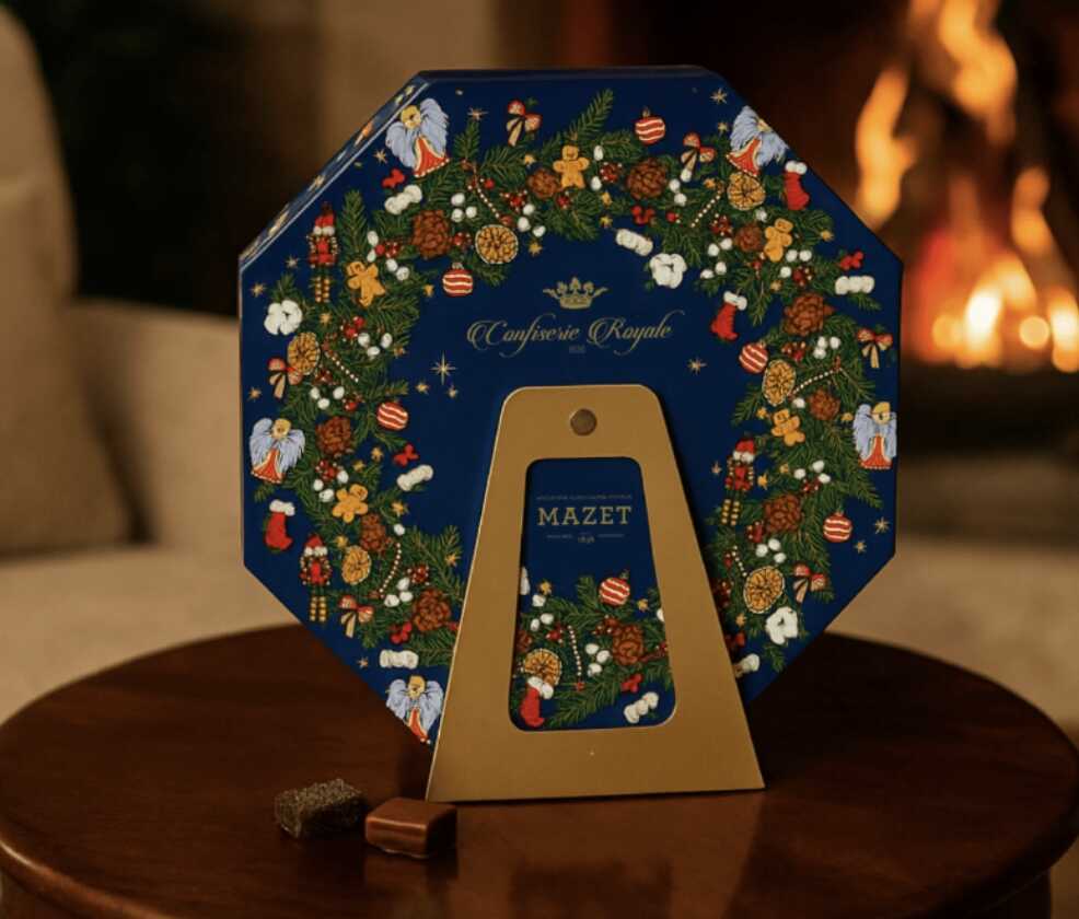 Cette année, la Maison Mazet dévoile La Roue de l’Avent de Noël. Elle s’inspire de celles des fêtes foraines des marchés de Noël. Chaque compartiment dévoile une douceur de la maison. On y retrouve une sélection exquise de chocolats au praliné, amandes enrobées de chocolat aux saveurs festives. Mais aussi nougats, pâtes de fruits, et les incontournables Praslines Mazet, une spécialité depuis 1636 ! 29€. mazetconfiseur.com