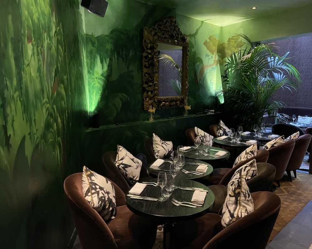 Dès l’entrée, l’expérience commence ! On pénètre dans une salle verdoyante, imaginée par la végétaliste Hanna Novak, où chaque détail est pensé. Au centre, le bar en marbre vert de Namibie impose son charme. Derrière lui, Hugo, mixologue discret mais audacieux, orchestre des cocktails et mocktails. Parmi ses créations : le Chill Desert, alliance de mezcal Jalapeño (alcool mexicain), sirop d’agave à la menthe, citron vert et une pointe de sel épicé. Ou le Movie Star, fruit de la passion, sirop de vanille et ginger pour un voyage aromatique inédit.