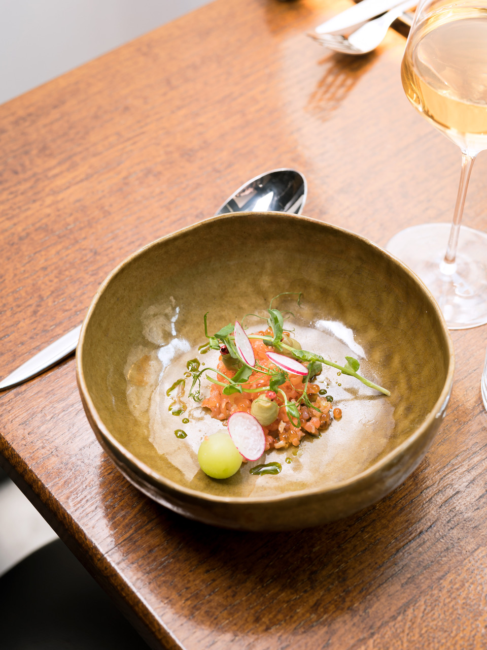 Stoïque dans sa cuisine ouverte, le chef Masatsugu Takahashi signe une cuisine personnelle, précise, sensible et sincère. Avec le produit en star absolu, des recettes aux goûts subtils qui vont à l’essentiel, et des saisons qui dictent les menus. Du coup, la concentration est grande devant les fourneaux. La viande est délicate. Les légumes gagnent en profondeur et en délicatesse. Le dressage reste minimal, jamais démonstratif, tandis que le service glisse avec fluidité, attentif.
