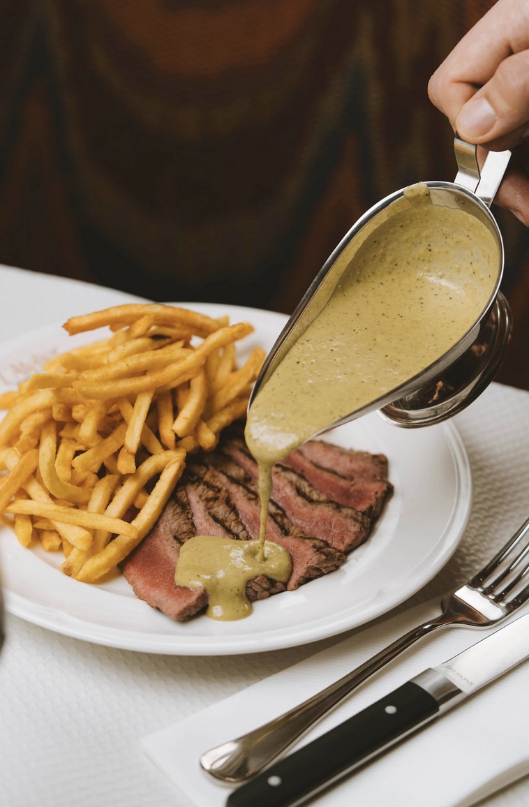 Un contre-filet français, un poulet fermier Label Rouge ou un smash burger généreux. Chaque plat arrive escorté de frites croustillantes à volonté et d’une sauce signature addictive aux teintes vertes. Le tout débute par une salade verte croquante, simple et parfaitement exécutée. Le service en deux temps maintient chaque bouchée chaude et désirée. Le midi, la formule s’affiche à 19,90€ , efficace et généreuse. Le soir, l’expérience complète s’étire autour de 29€, les vins français accompagnant le repas avec justesse et simplicité.