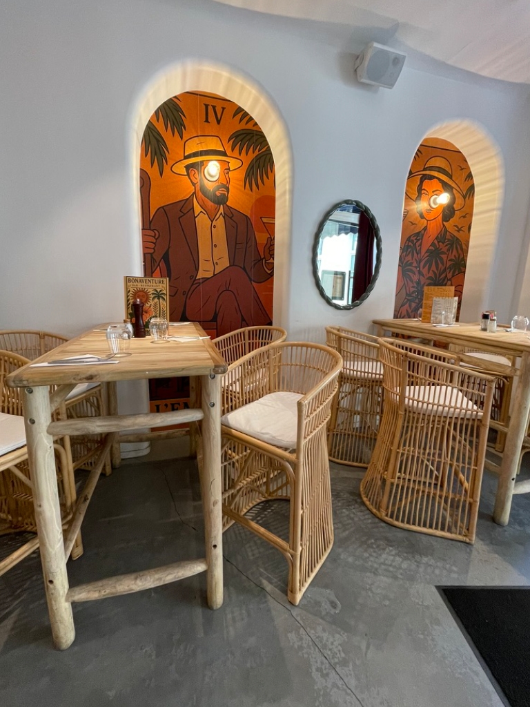 Ici, l’œuf bio et mayonnaise maison au piment d’Espelette fait plus que de la figuration. Il met plutôt de l’entrain au rythme du repas. Il précède un pavé de saumon sauce cajun, des gambas poêlées risotto butternut au parmesan ou une cuisse de poulet fermier à l’écrasée de pomme de terre. Pour les plus pressés, Bonaventure propose même quelques pizzas : Margarita au pesto, papesse à la crème de truffe, Magicienne au quatre fromages et Gratinata de la Fortune aux légumes grillés, se dévorent carrément avec les doigts.